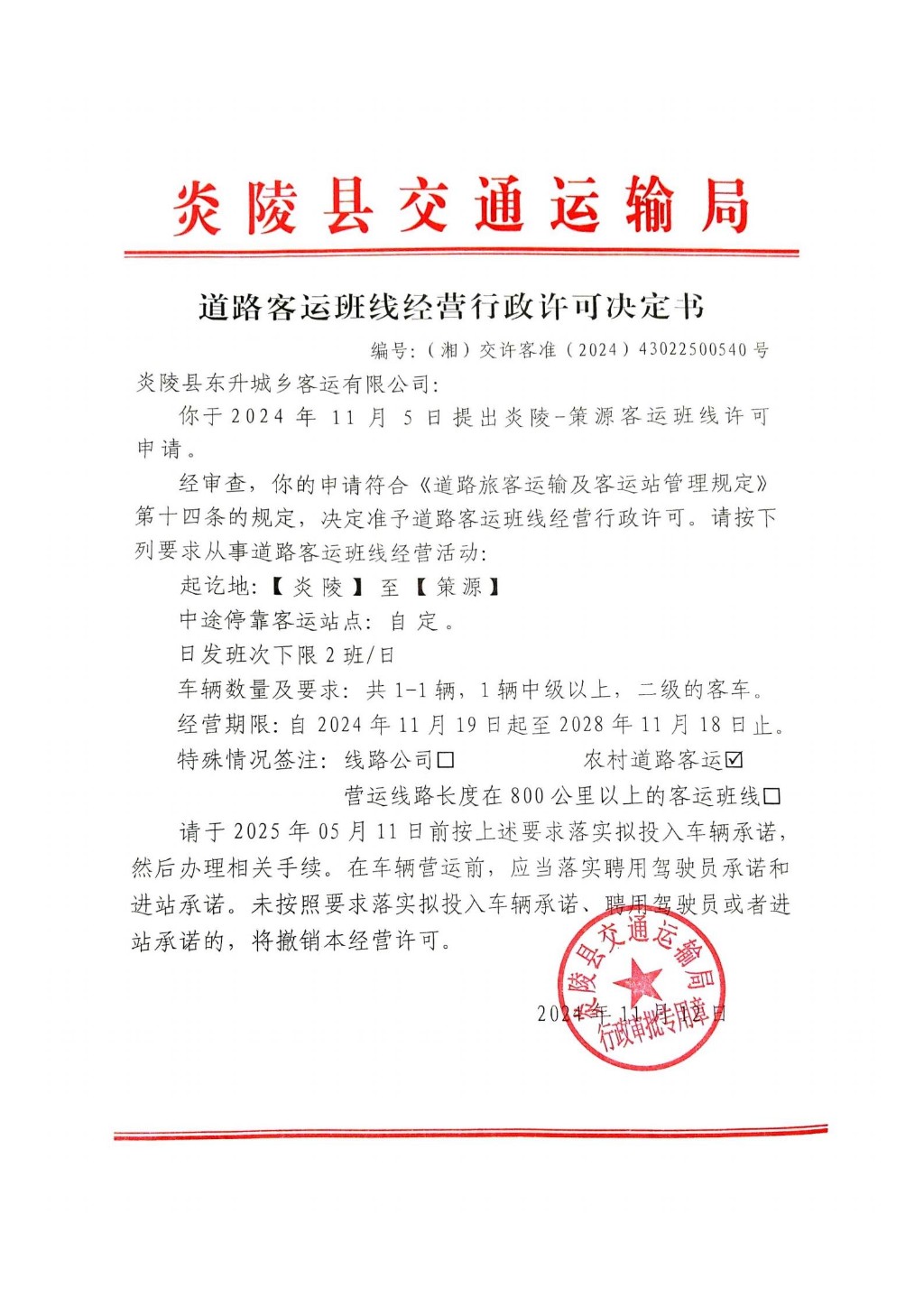 炎陵县交通运输局道路客运班线经营行政许可决定书(湘)交许客准〔2024〕43022500540号