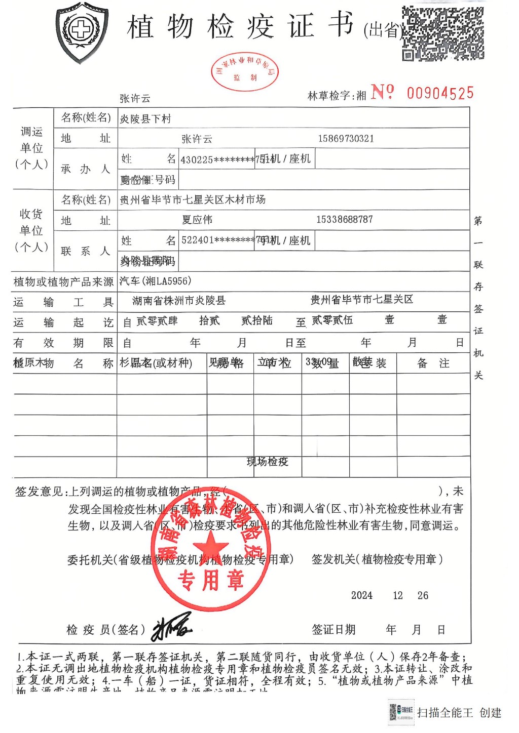 炎陵县林业局植物检疫证书林草检字:湘No 00904525