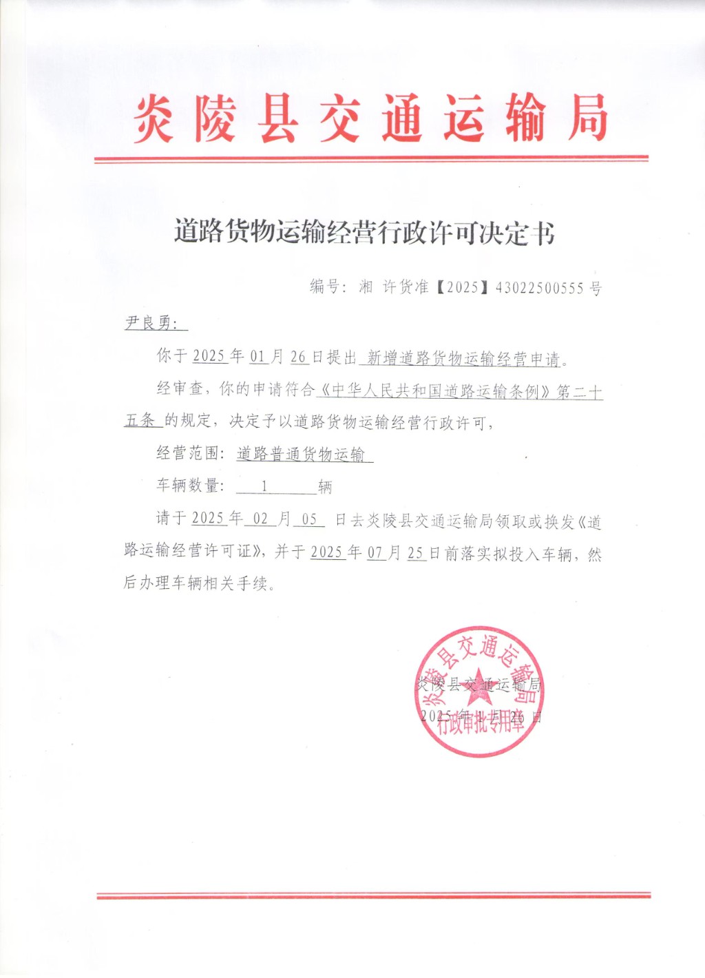 炎陵县交通运输局道路货物运输经营行政许可决定书(湘)许货准〔2025〕43022500555号