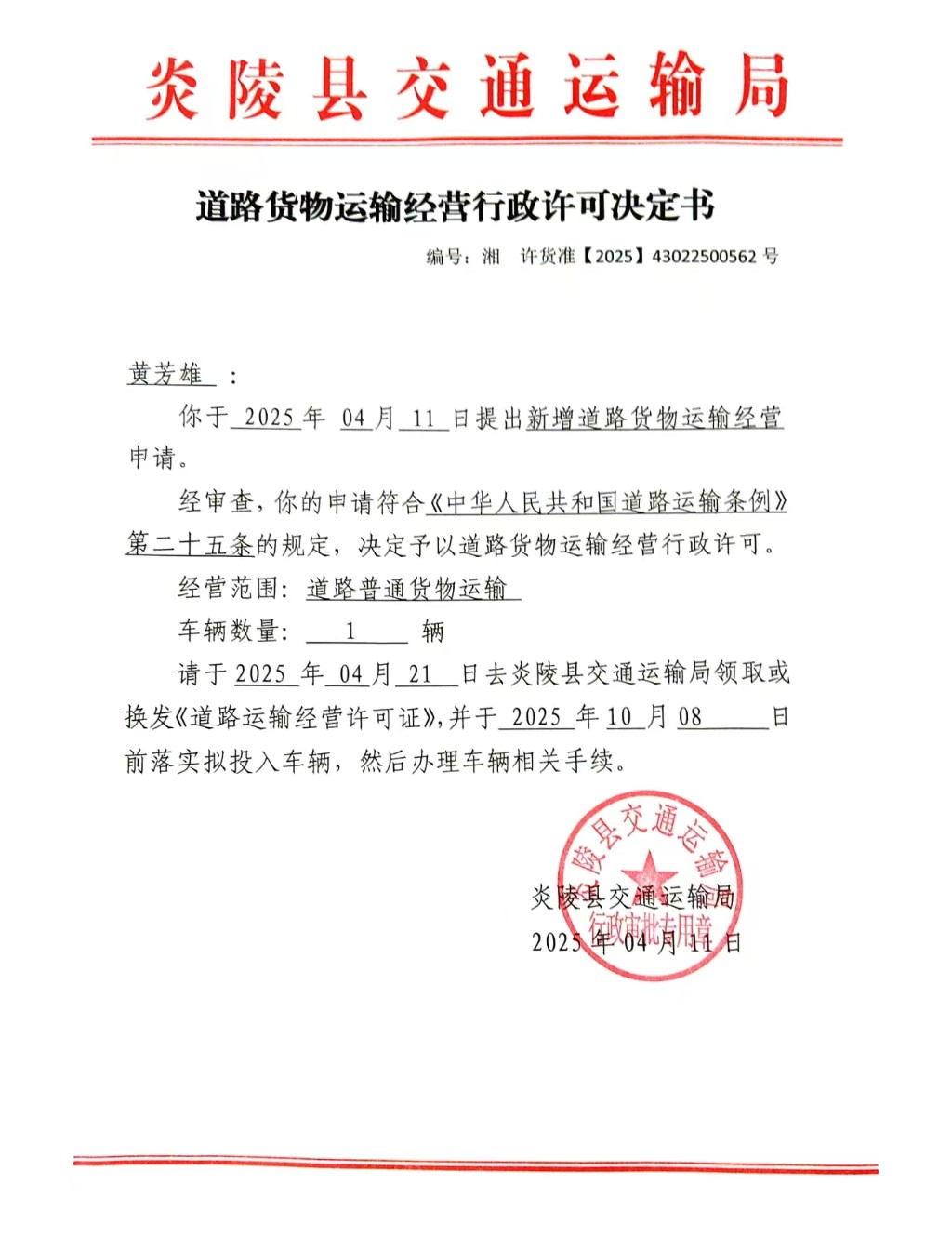 炎陵县交通运输局道路货物运输经营行政许可决定书(湘)许货准〔2025〕43022500562号