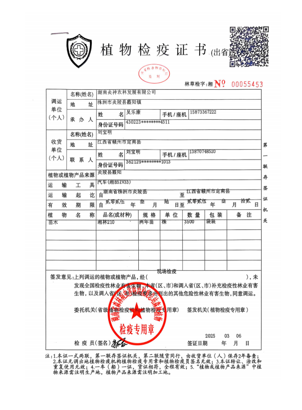 炎陵县林业局植物检疫证书林草检字:湘No 00055453