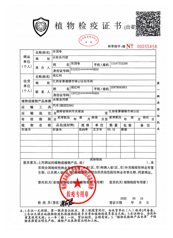 炎陵县林业局植物检疫证书林草检字:湘No 00055458