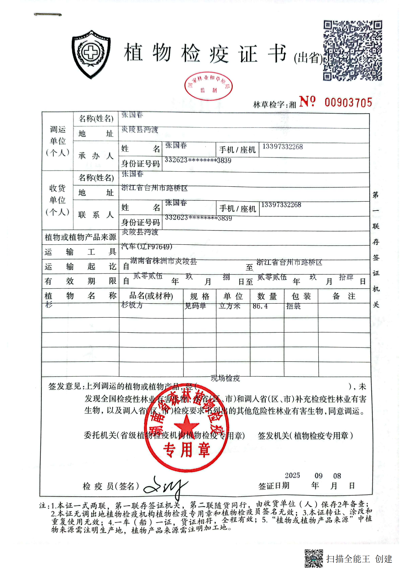 炎陵县林业局植物检疫证书林草检字:湘No 00903705