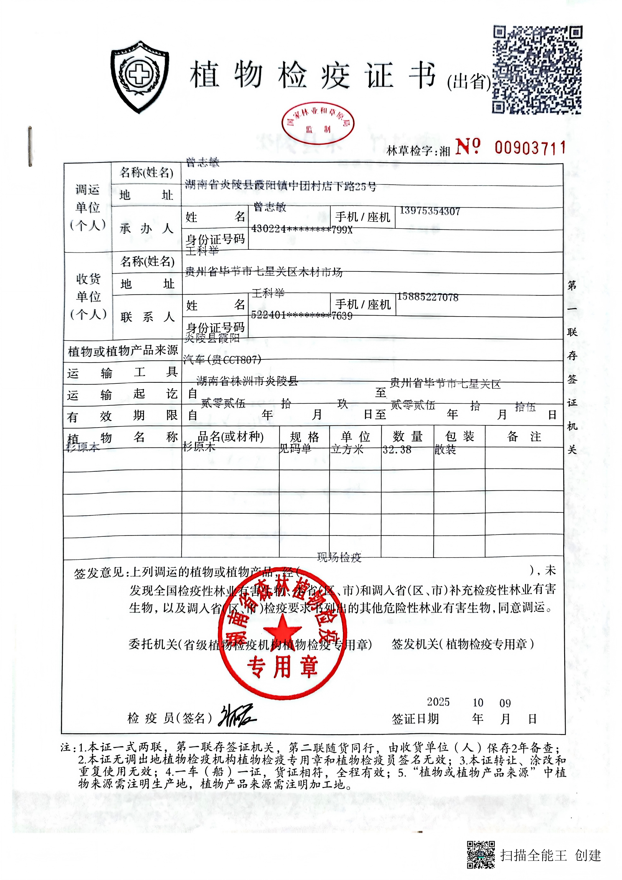 炎陵县林业局植物检疫证书林草检字:湘No 00903711