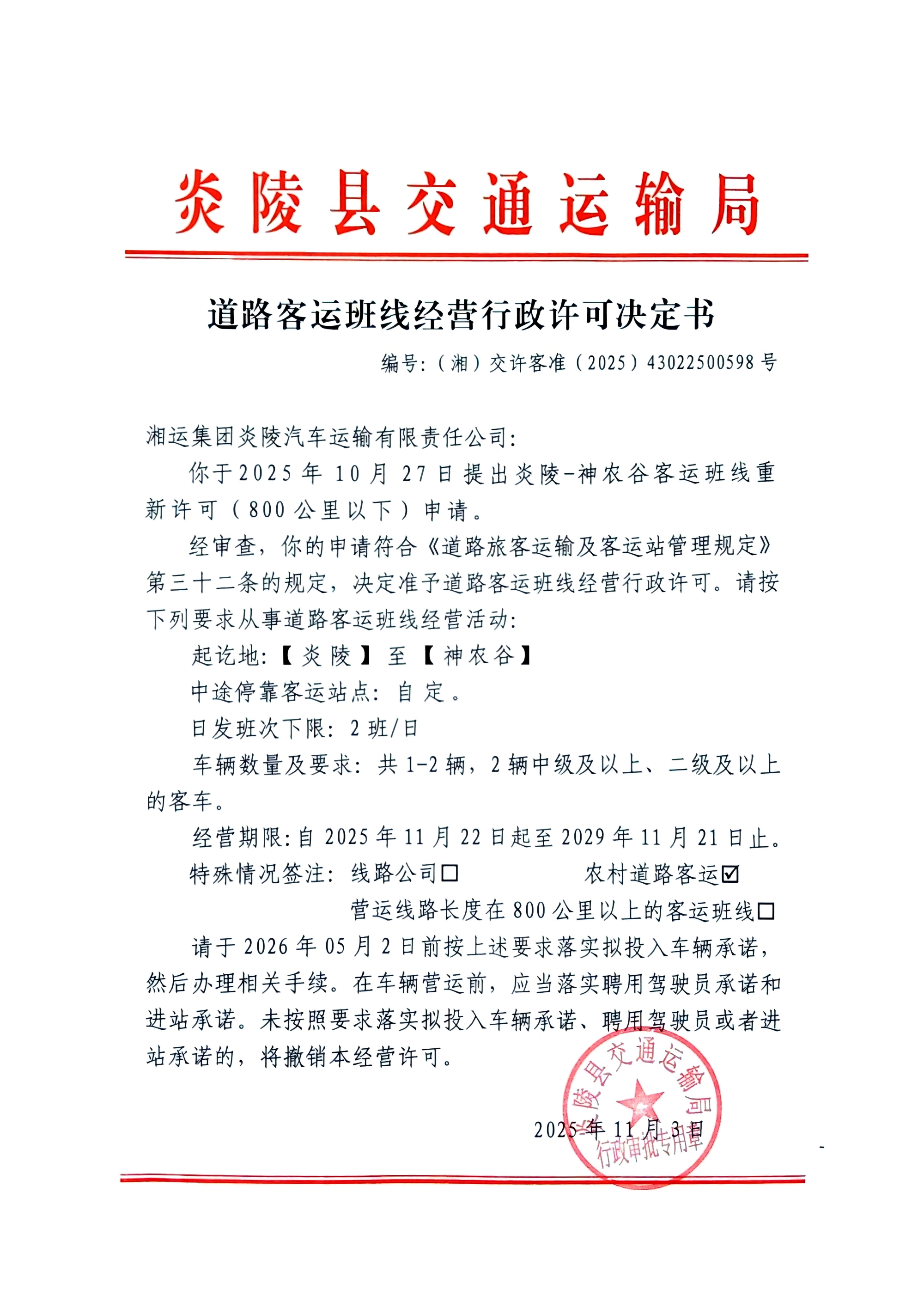 炎陵县交通运输局道路客运班线经营行政许可决定书(湘)交许客准〔2025〕43022500598号
