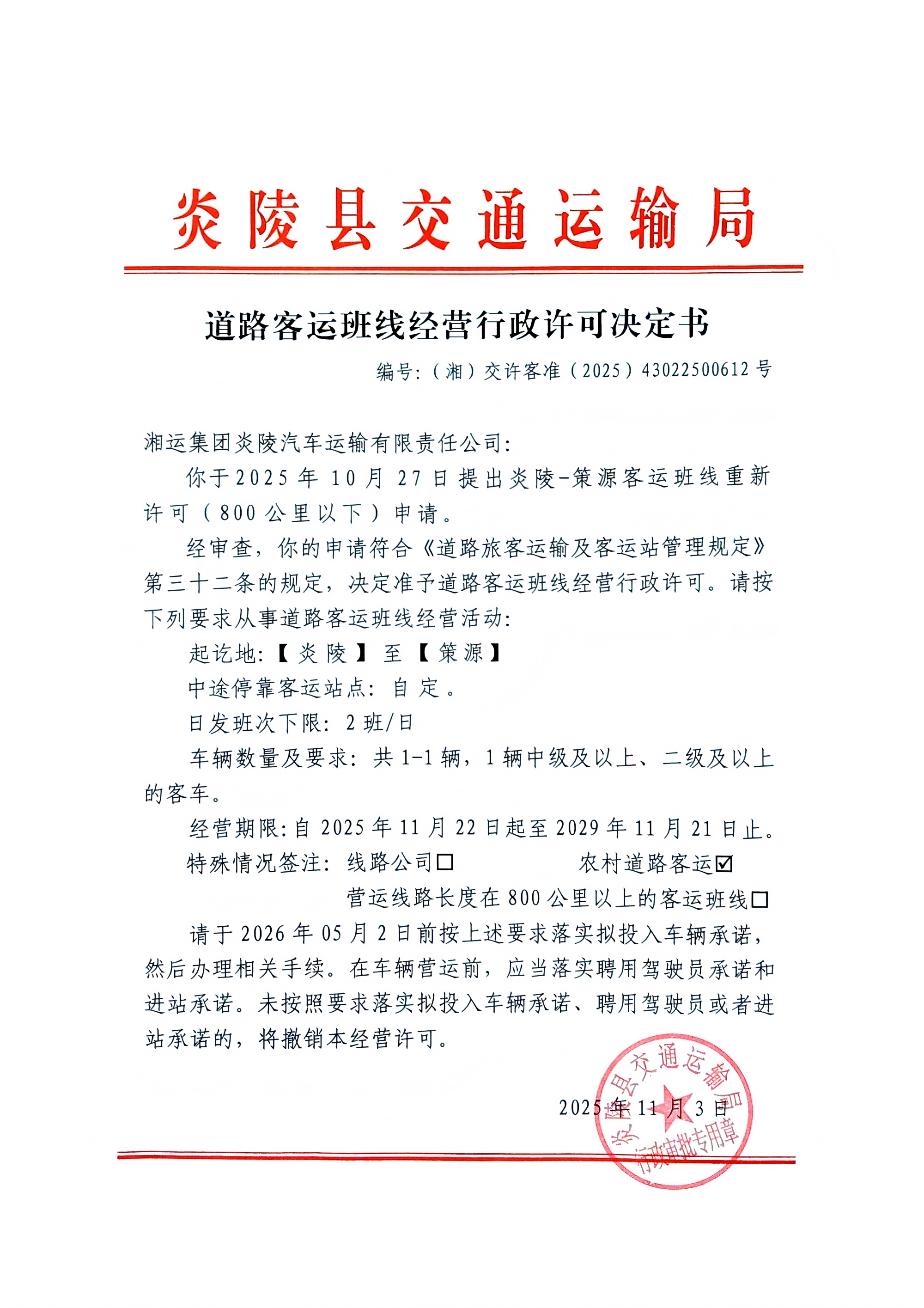 炎陵县交通运输局道路客运班线经营行政许可决定书(湘)交许客准〔2025〕43022500612号