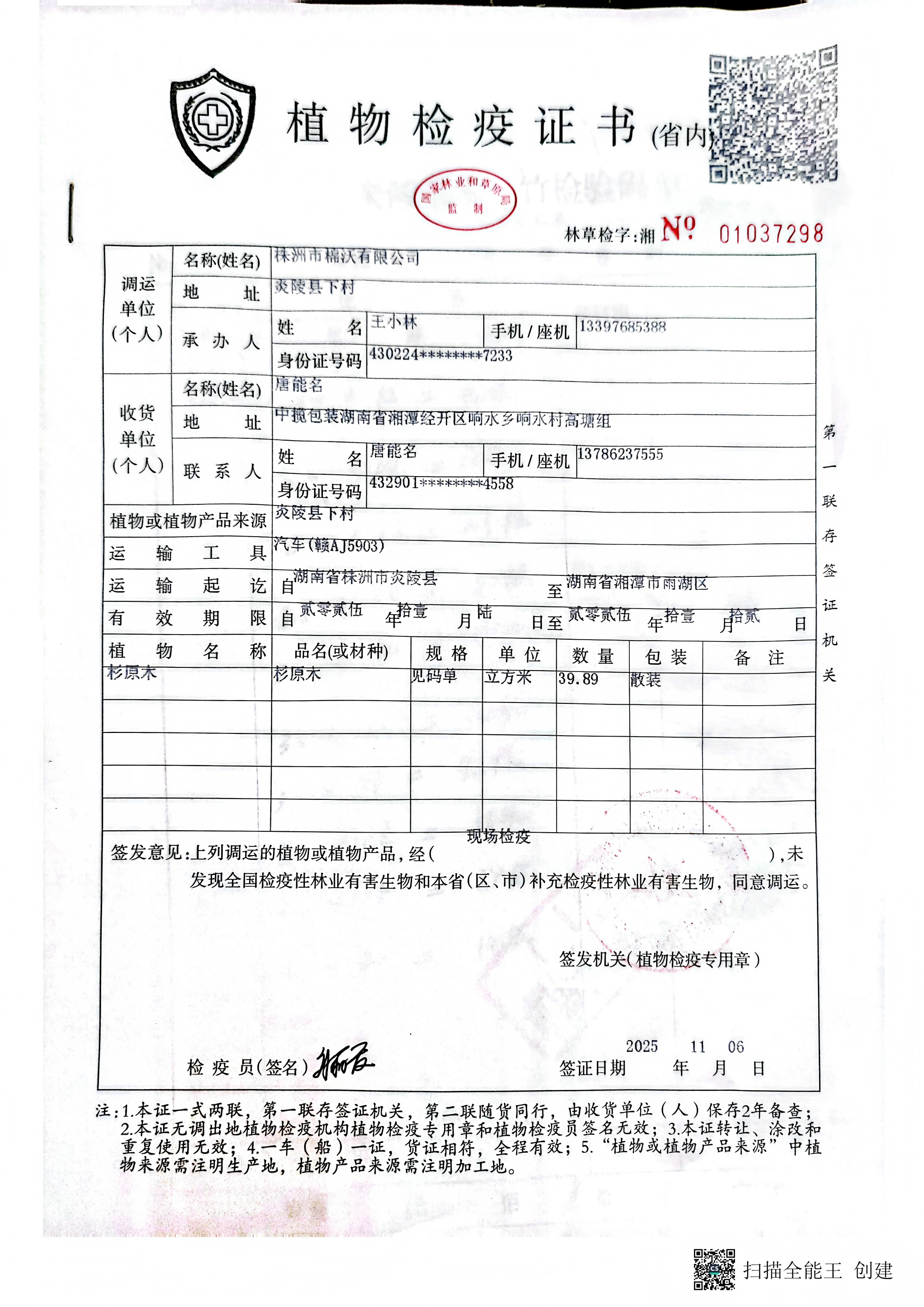 炎陵县林业局植物检疫证书林草检字:湘No 01037298