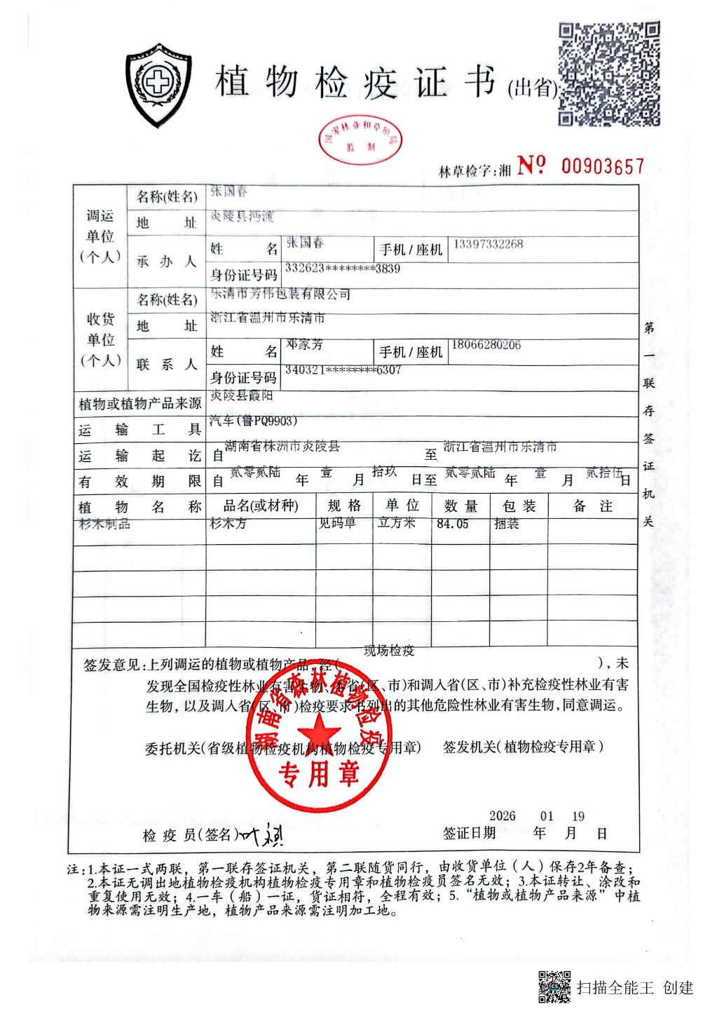 炎陵县林业局植物检疫证书林草检字:湘No 00903657