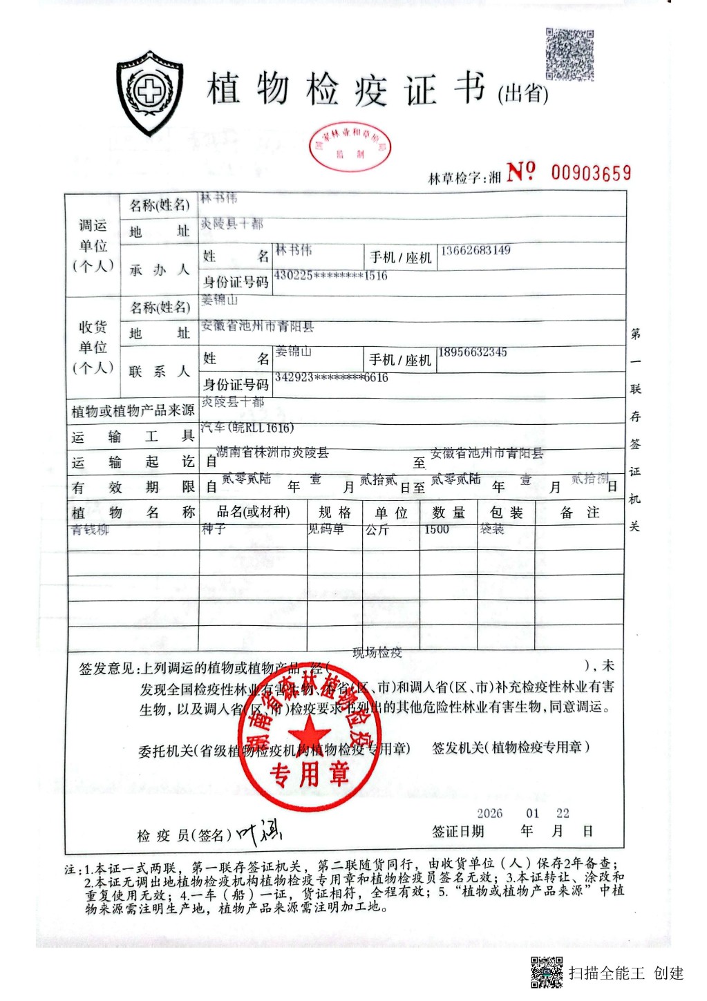 炎陵县林业局植物检疫证书林草检字:湘No 00903659