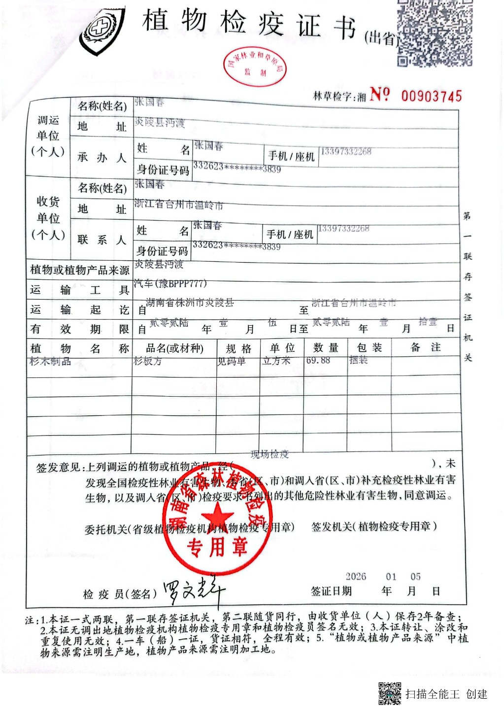 炎陵县林业局植物检疫证书林草检字:湘No 00903745