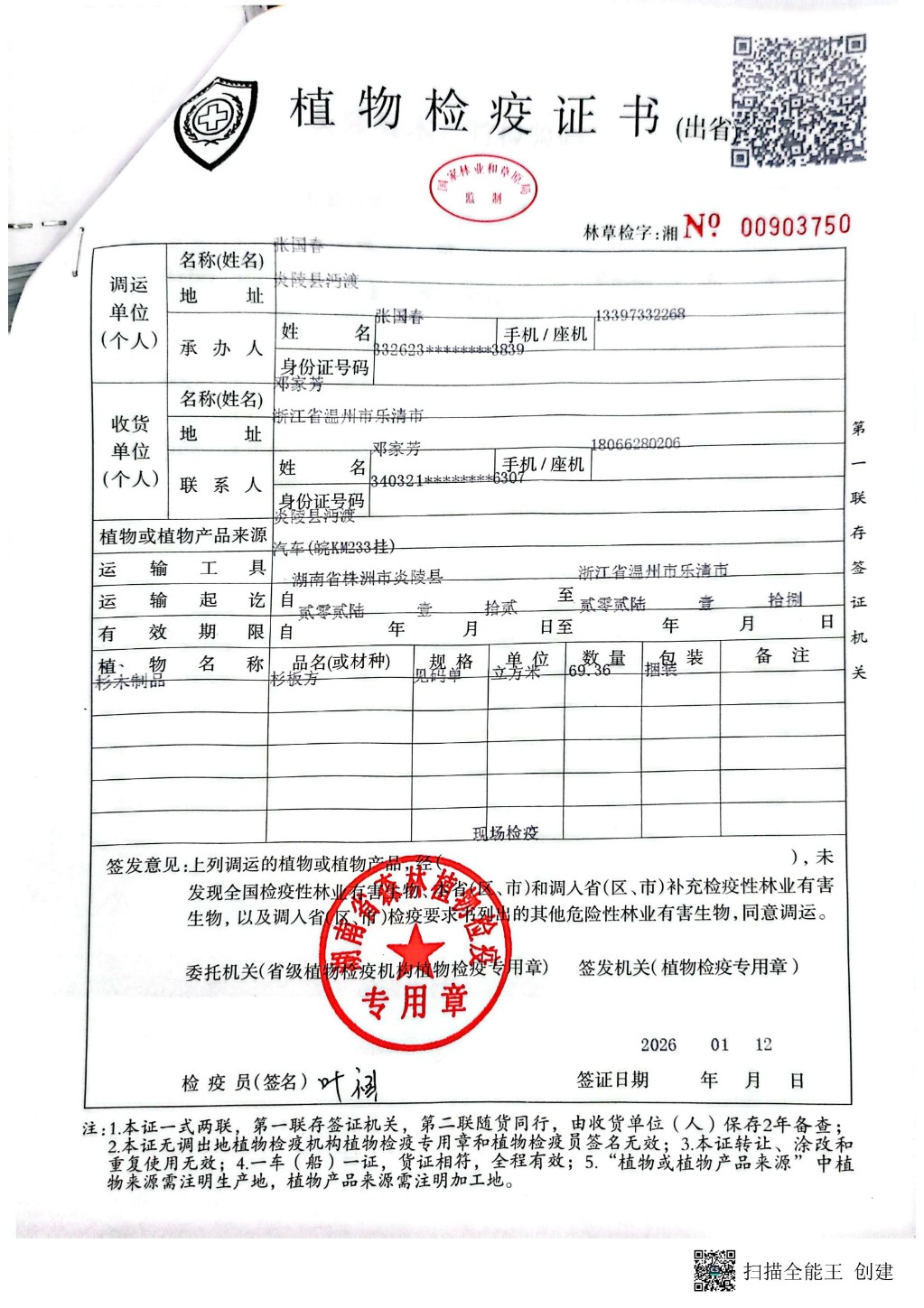 炎陵县林业局植物检疫证书林草检字:湘No 00903750