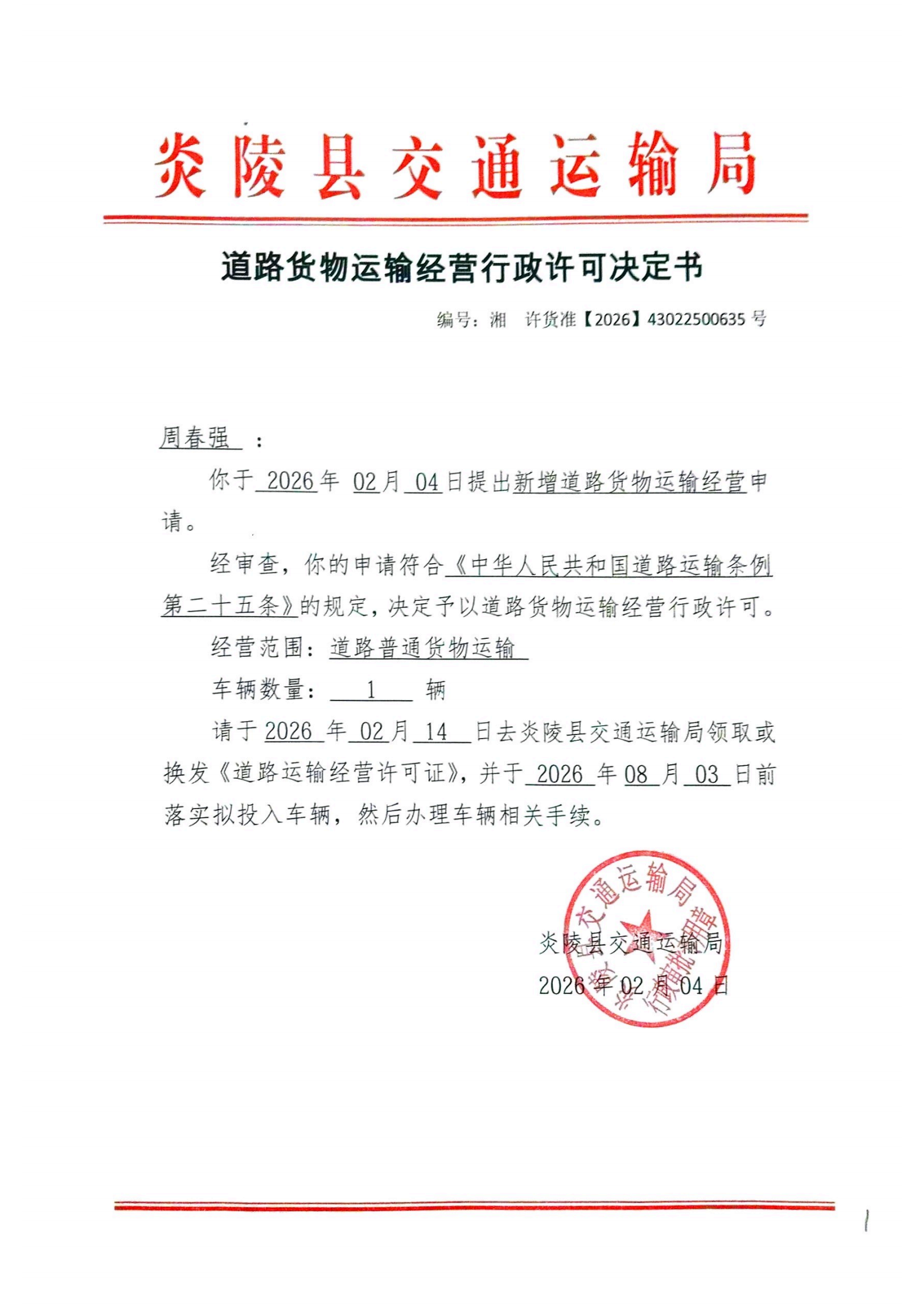 炎陵县交通运输局道路货物经营行政许可决定书(湘)交许货准〔2025〕43022500635号