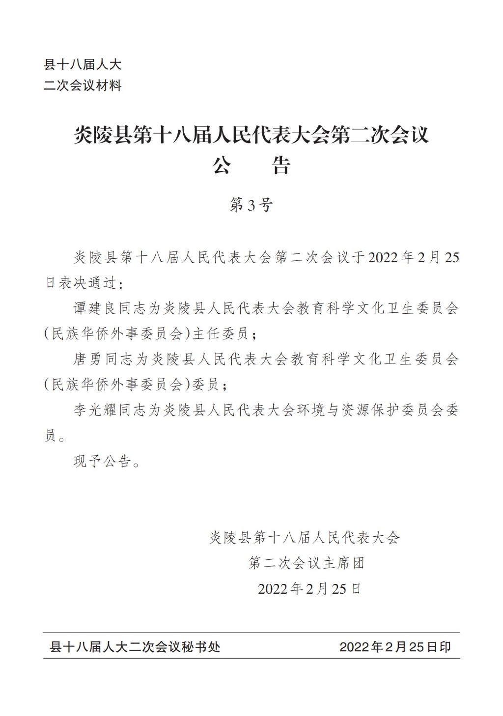 炎陵县第十八届人民代表大会第二次会议公告第3号