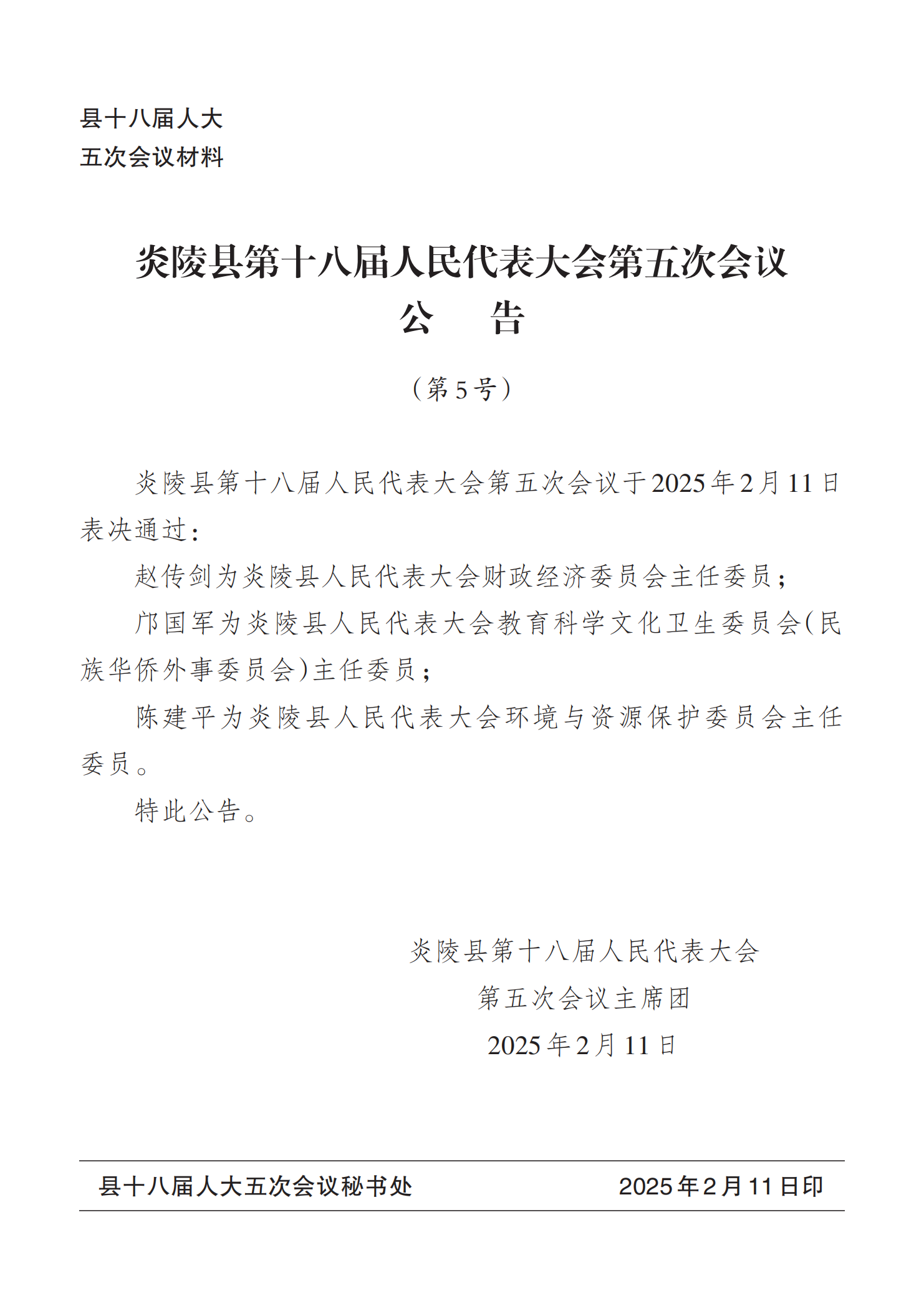 炎陵县第十八届人民代表大会第五次会议公告(第5号)