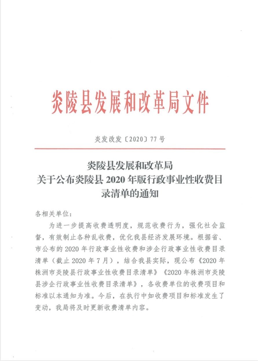 文件下载:关于公布炎陵县2020年版行政事业性收费目录清单的通知