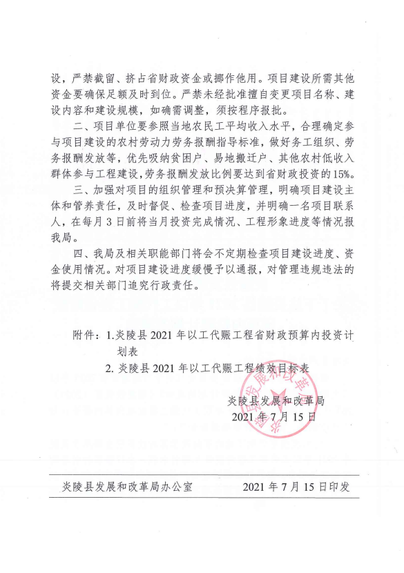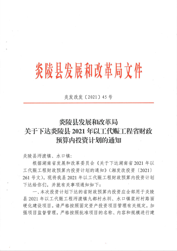 关于下达炎陵县2021年以工代赈工程省财政预算内投资计划的通知