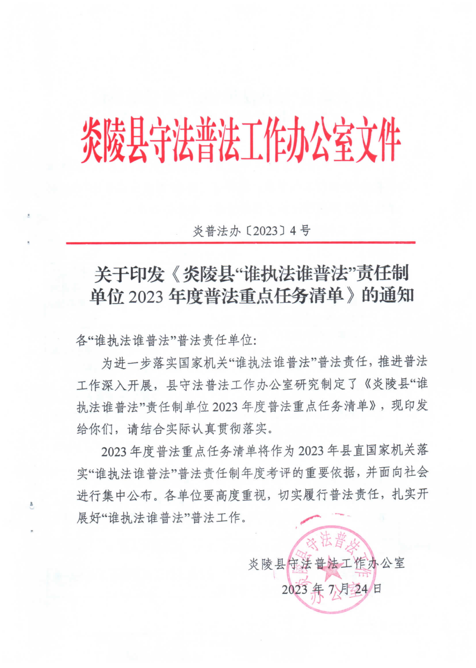关于印发《炎陵县“谁执法谁普法”责任制单位2023年度普法重点任务清单》的通知
