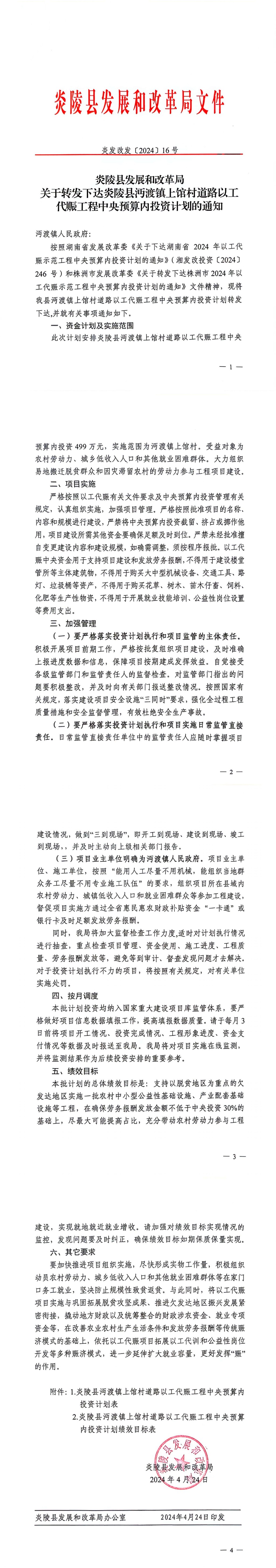 关于转发下达炎陵县沔渡镇上馆村道路以工代赈工程中央预算内投资计划的通知
