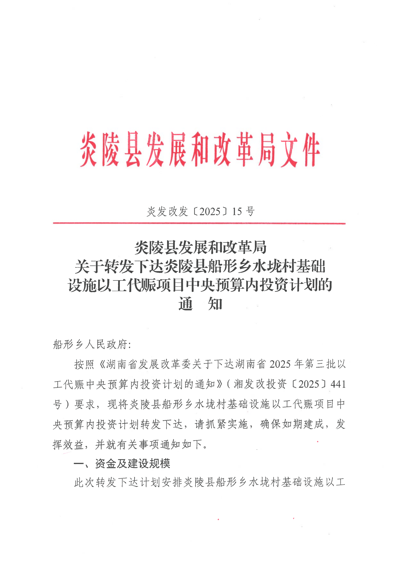 文件下载:关于转发下达炎陵县船形乡水垅村基础设施以工代赈项目中央预算内投资计划的通知