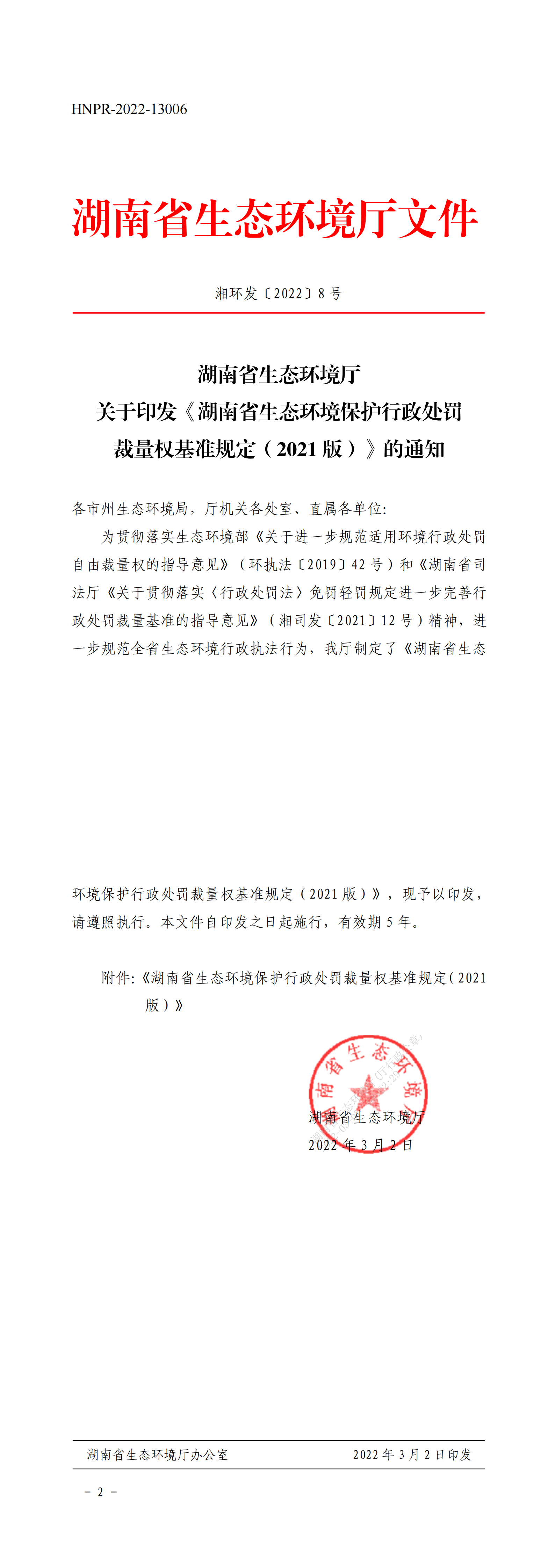关于印发《湖南省生态环境保护行政处罚裁量权基准规定(2021版)》的通知