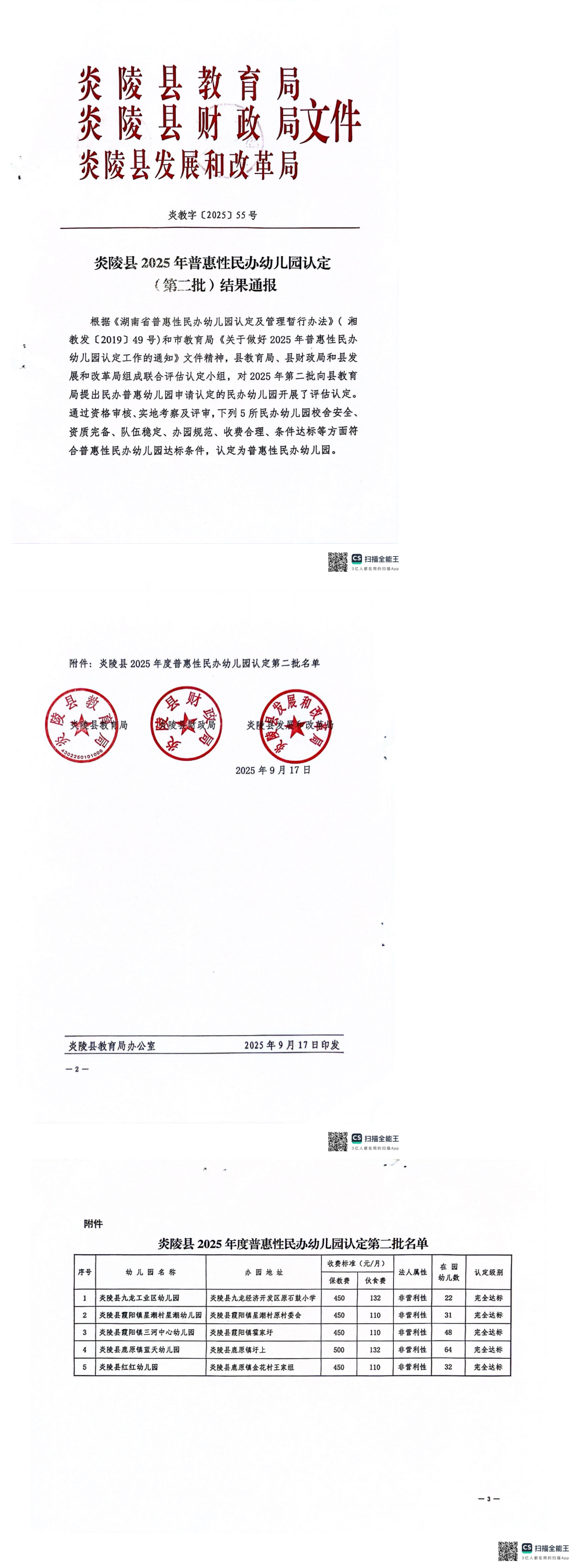 炎陵县2025年普惠性民办幼儿园认定(第二批)结果通报