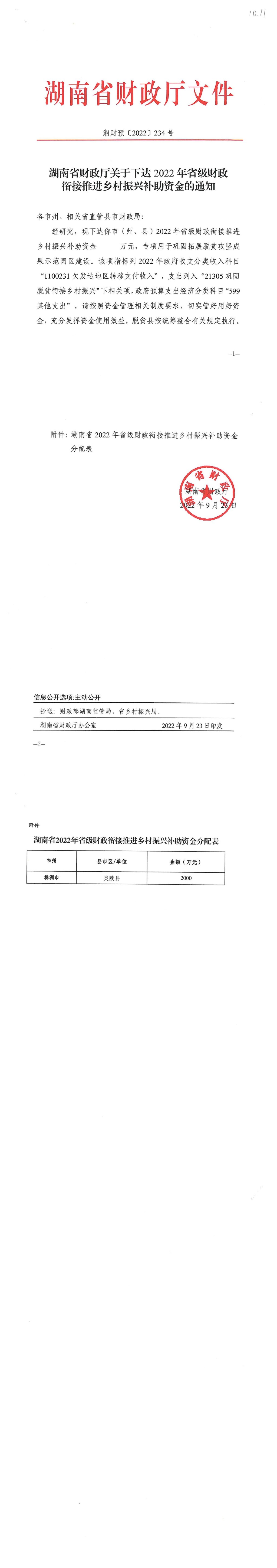 湖南省财政厅关于下达2022年省级财政衔接推进乡村振兴补助资金的通知(湘财预〔2022〕234号)