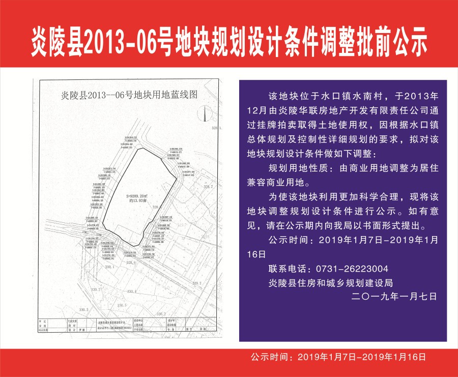 炎陵县2013-06号地块规划设计条件调整批前公示