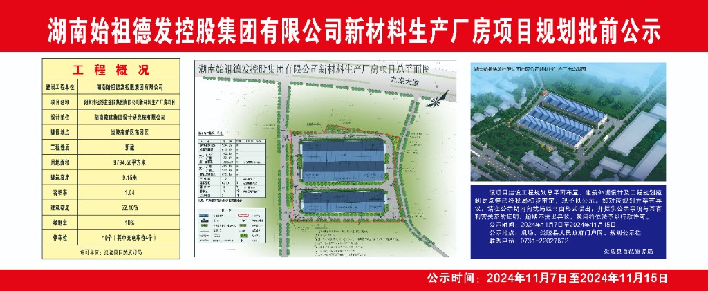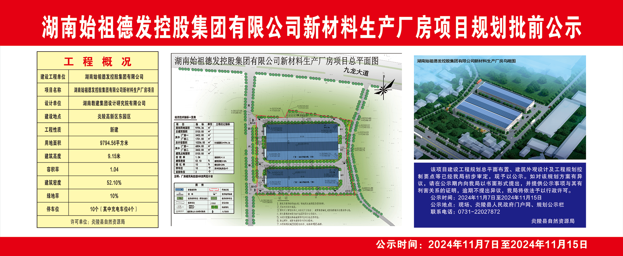 湖南始祖发控股集团有限公司新材料生产厂房项目规划批前公示