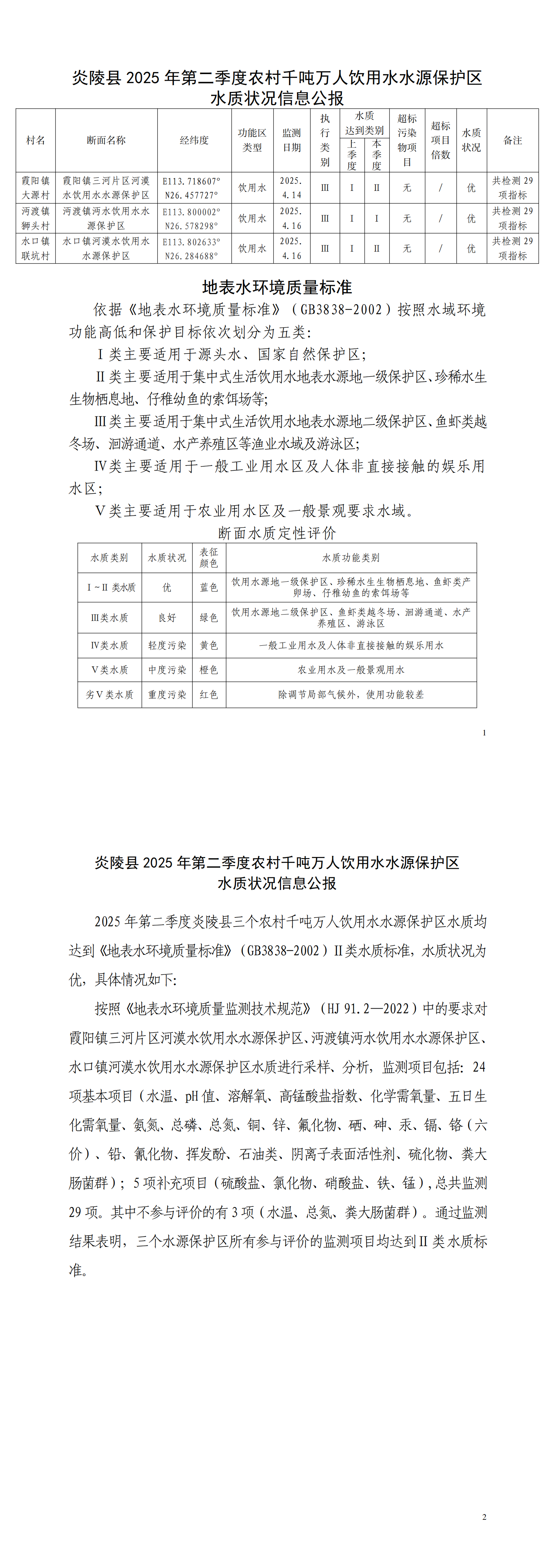炎陵县2025年第二季度农村千吨万人饮用水水源保护区水质状况信息公报