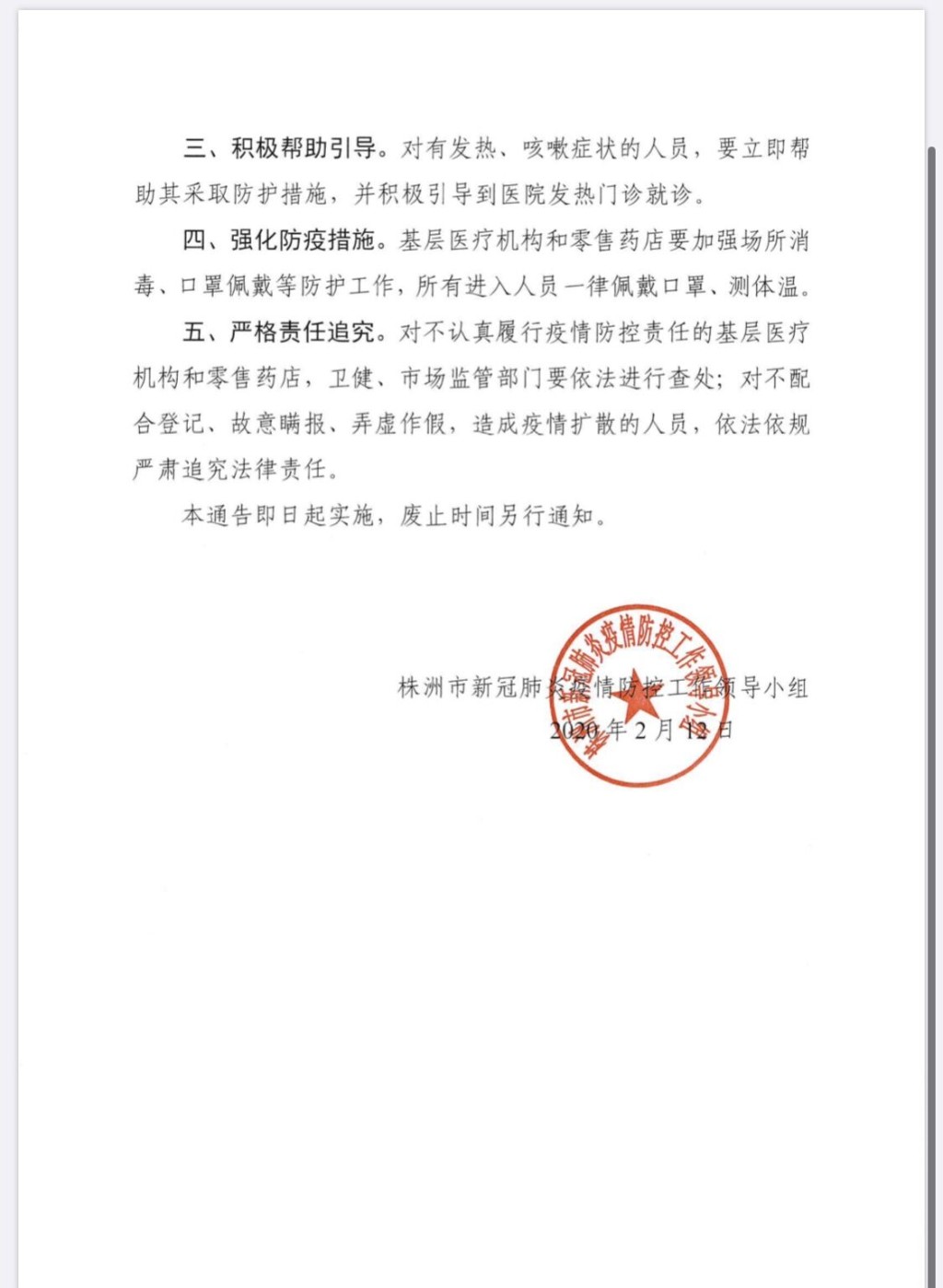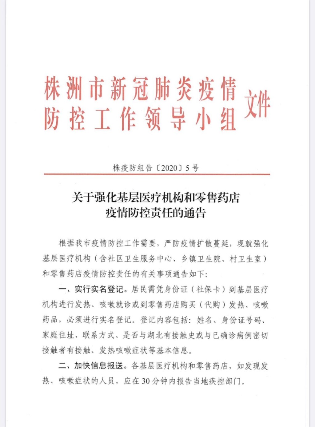 株洲市关于强化基层医疗机构和零售药店疫情防控责任的通告
