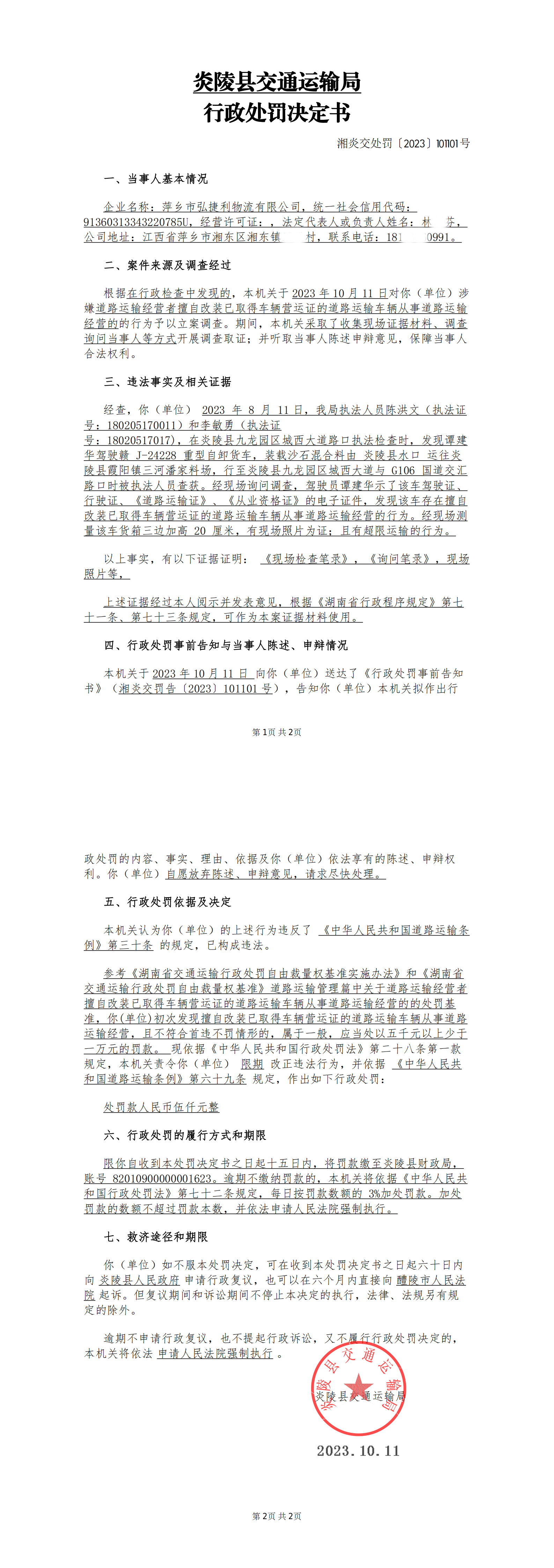 炎陵县交通运输局行政处罚决定书湘炎交处罚〔2023〕101101号