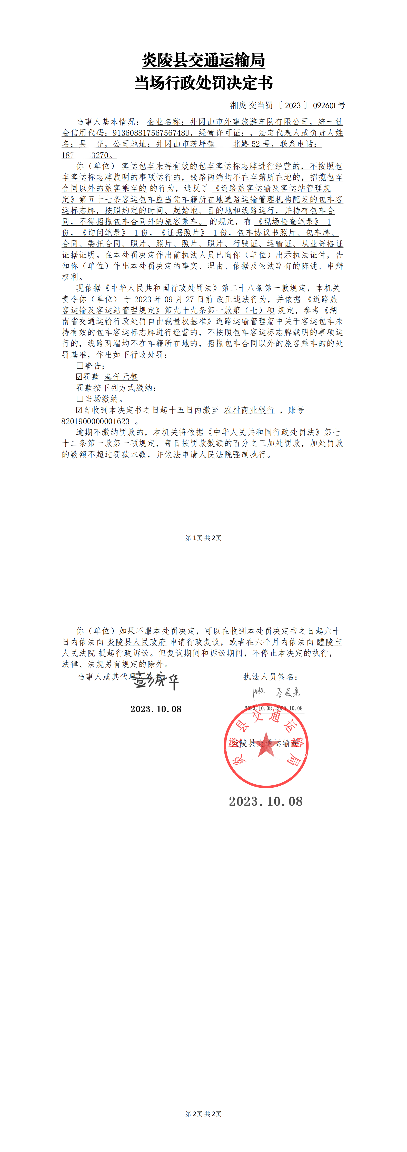 炎陵县交通运输局当场行政处罚决定书湘炎交当罚〔2023〕092601号