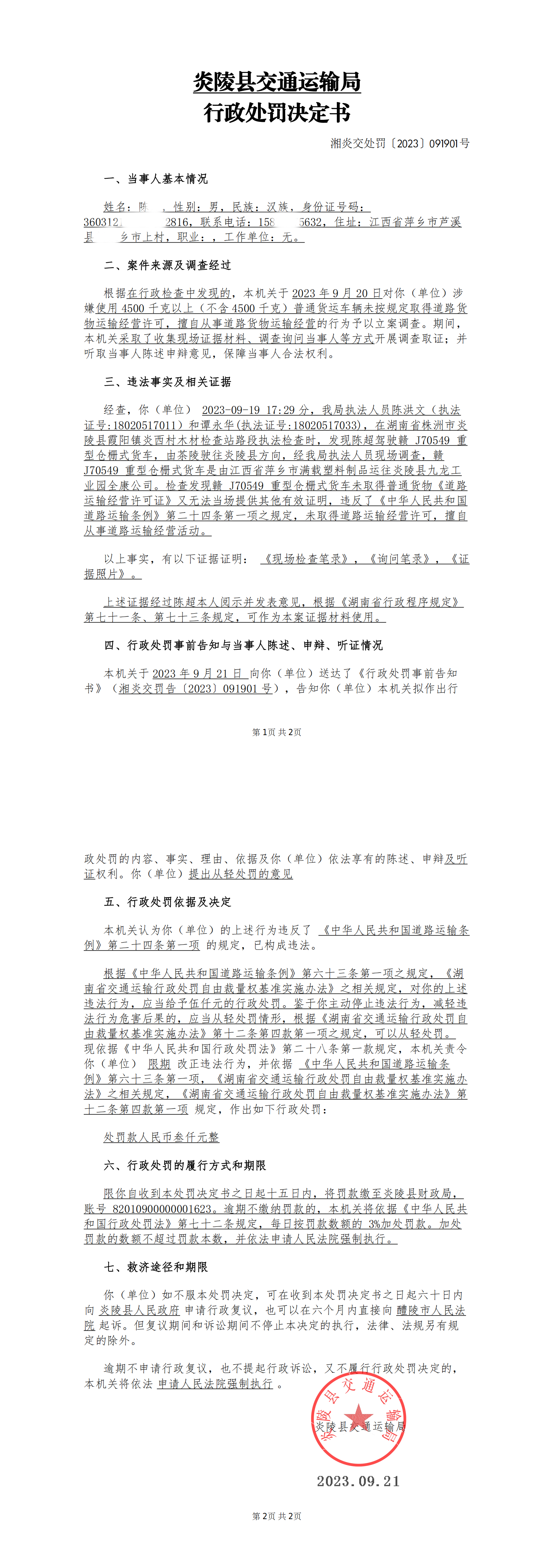 炎陵县交通运输局行政处罚决定书湘炎交处罚〔2023〕091901号