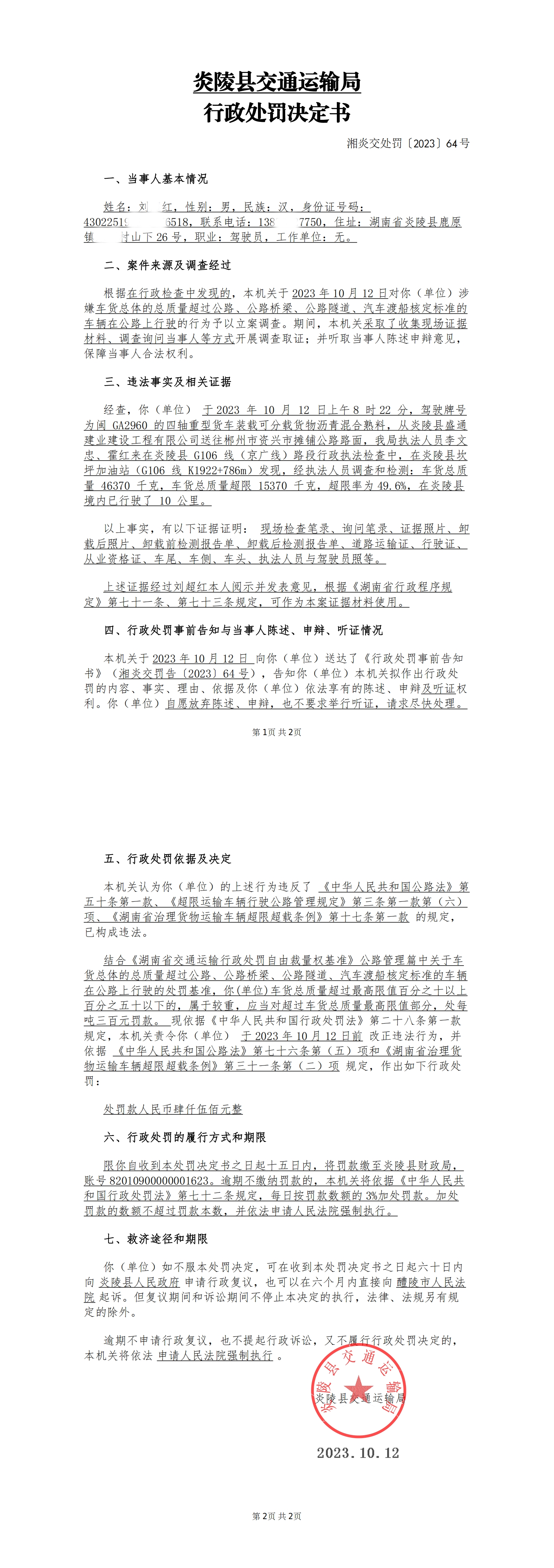 炎陵县交通运输局行政处罚决定书湘炎交处罚〔2023〕64号