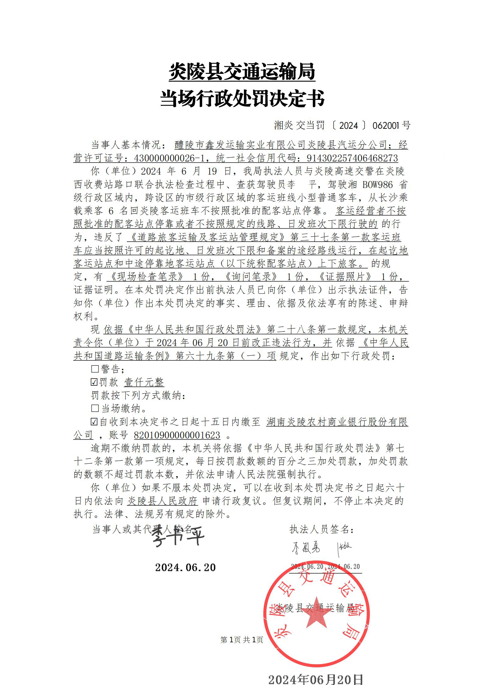 炎陵县交通运输局行政处罚决定书湘炎交当罚〔2024〕062001号