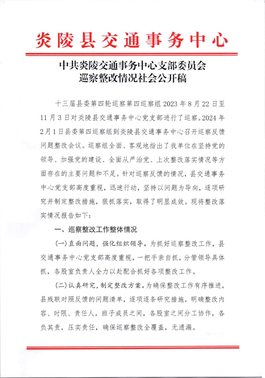 中共炎陵交通事务中心支部委员会巡察整改情况社会公开稿