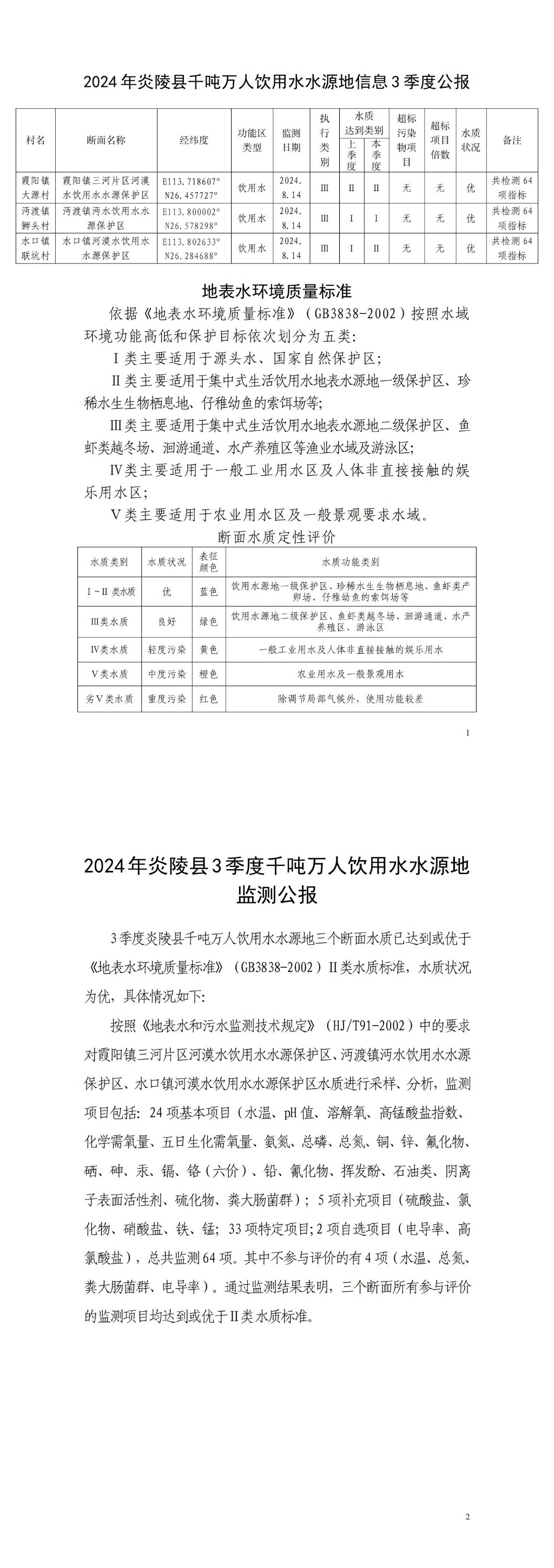 附件:2024年炎陵县千吨万人饮用水水源地信息3季度公报
