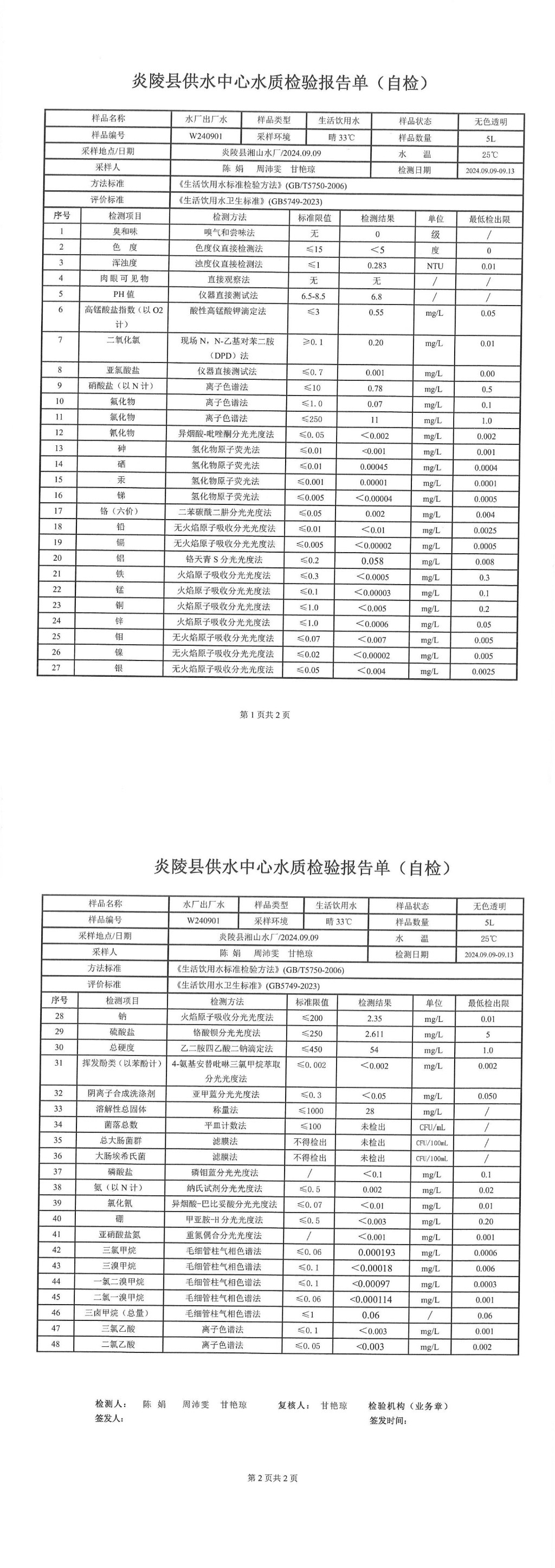 2024年9月份炎陵县自来水供水中心水质检验报告单(自检)