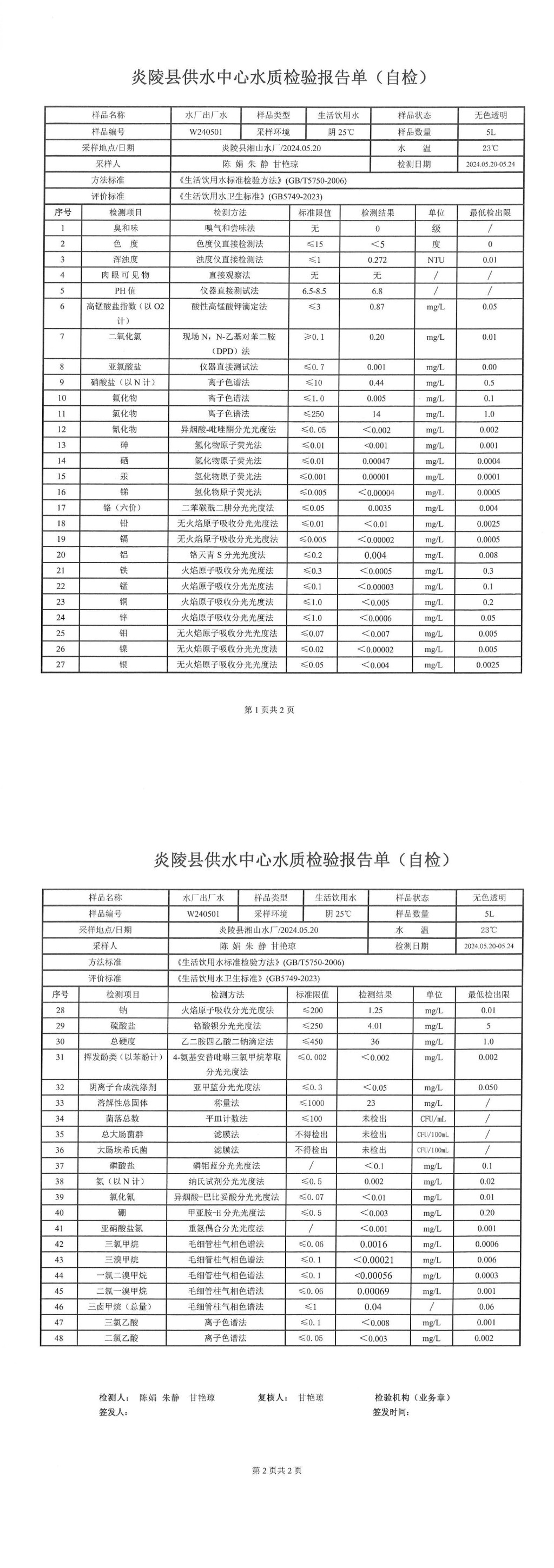 2024年5月份炎陵县自来水供水中心水质检验报告单(自检)
