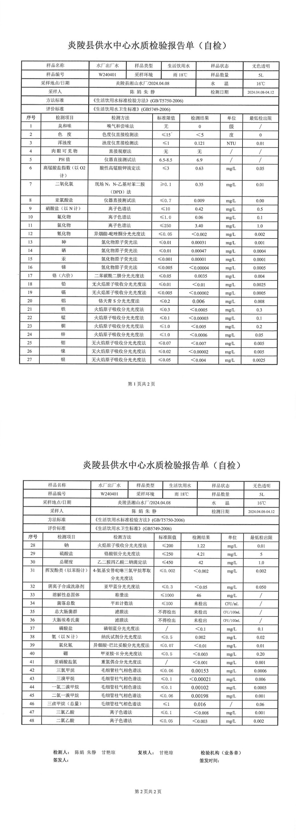 2024年4月份炎陵县自来水供水中心水质检验报告单(自检)