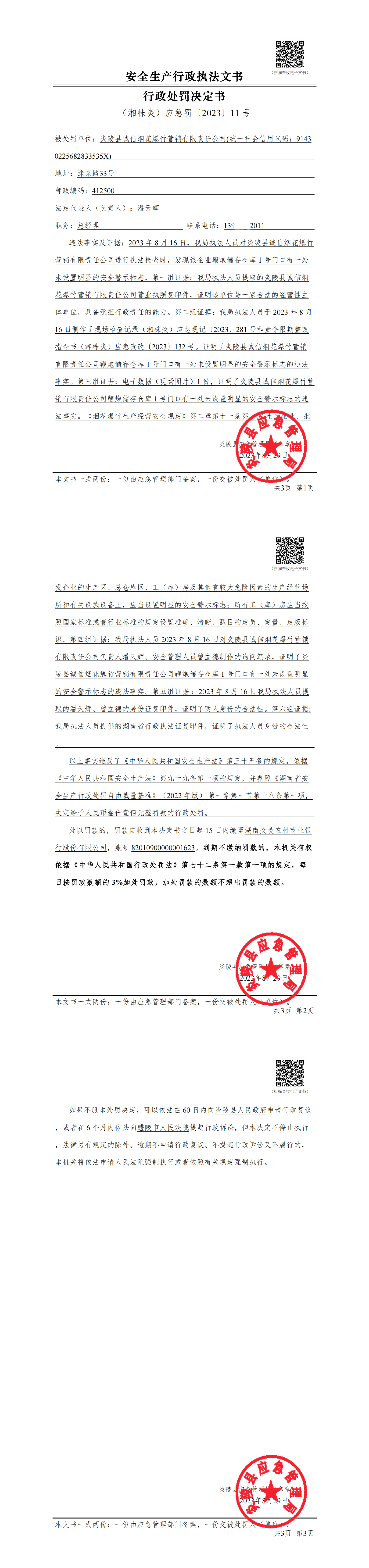 炎陵县应急管理局行政处罚决定书(湘株炎)应急罚〔2023〕11号