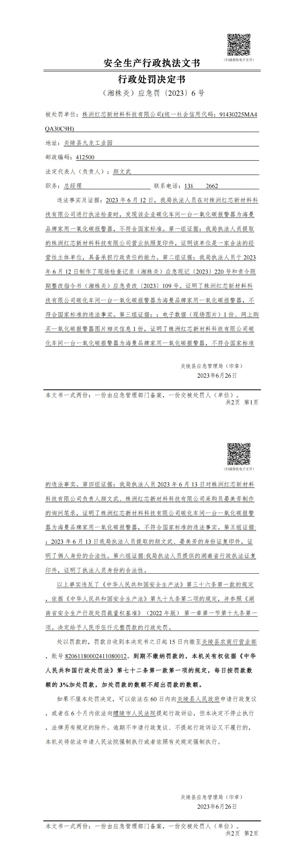 炎陵县应急管理局行政处罚决定书(湘株炎)应急罚〔2023〕6 号