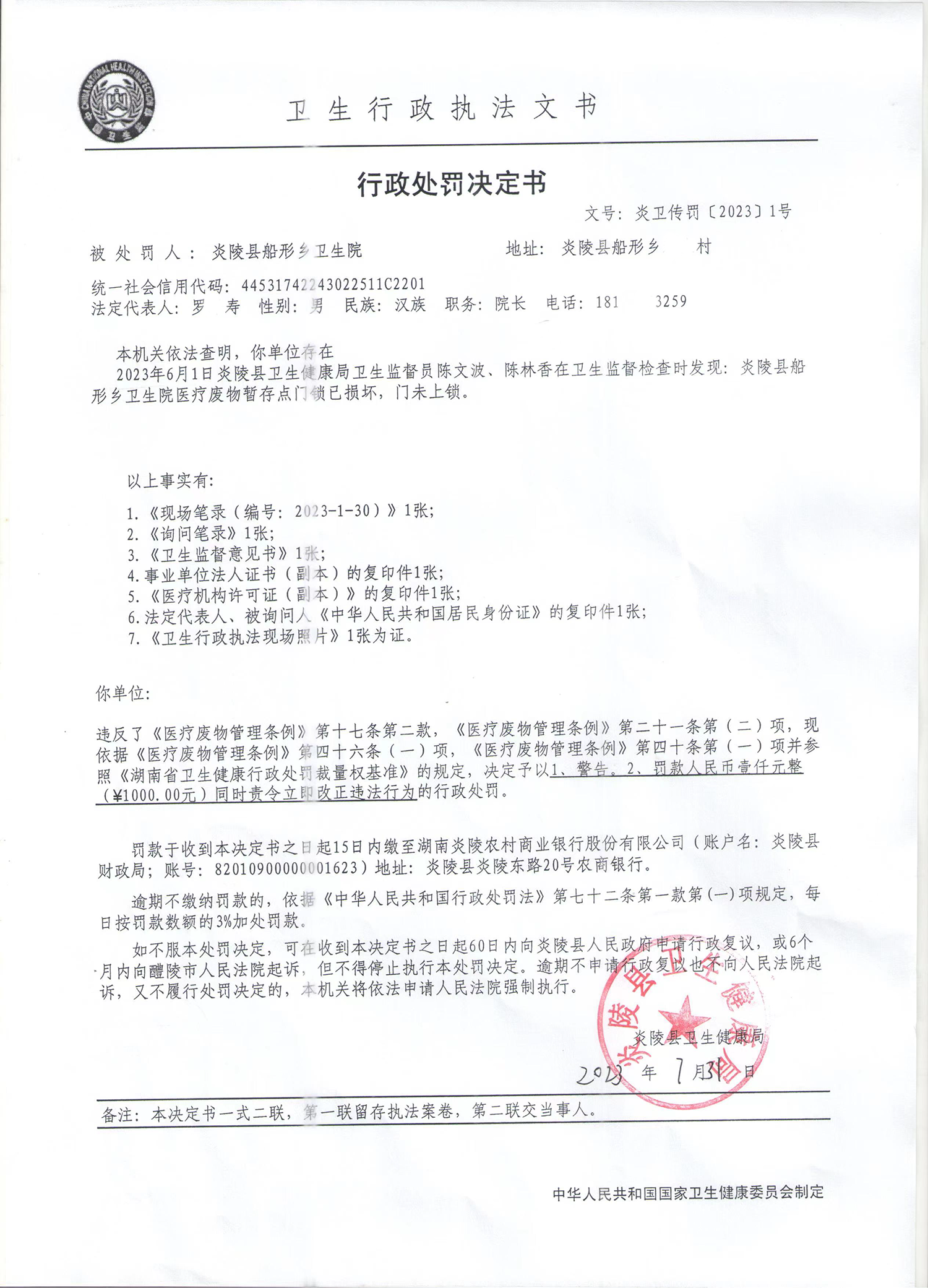 炎陵县卫生健康局行政处罚决定书炎卫传罚〔2023〕1号