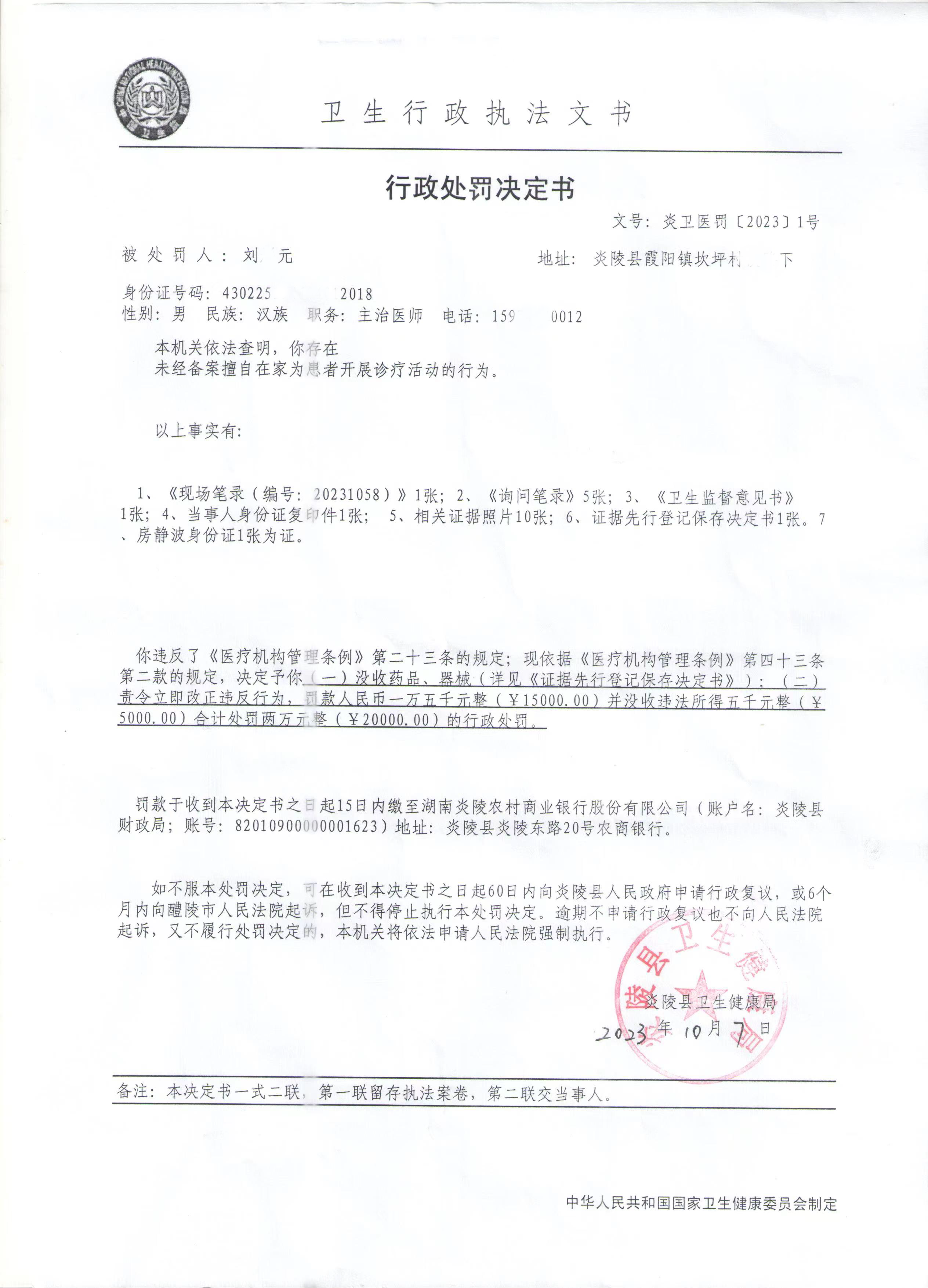 炎陵县卫生健康局行政处罚决定书炎卫医罚〔2023〕1号