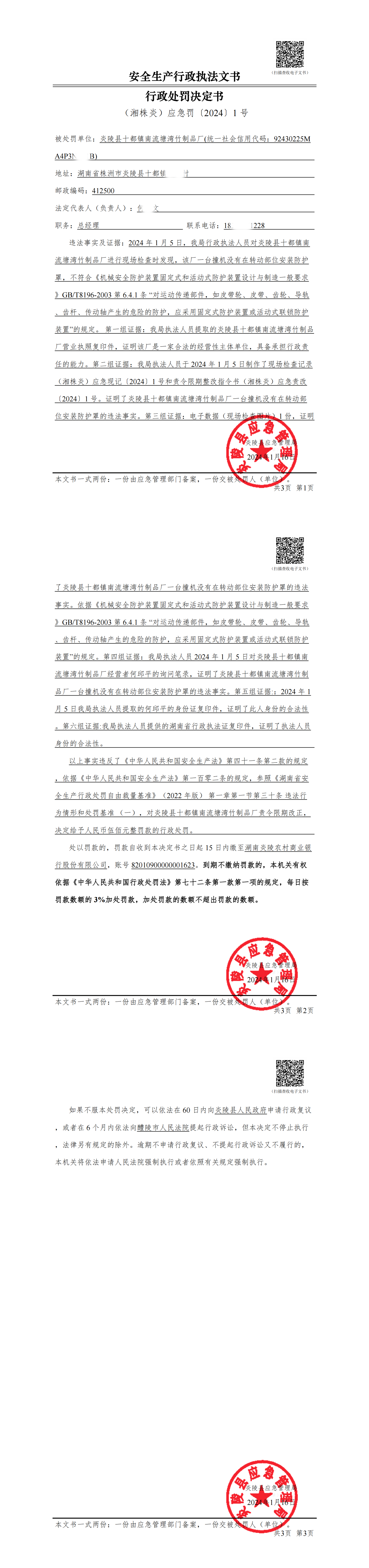 炎陵县应急管理局行政处罚决定书(湘株炎)应急罚〔2024〕1号
