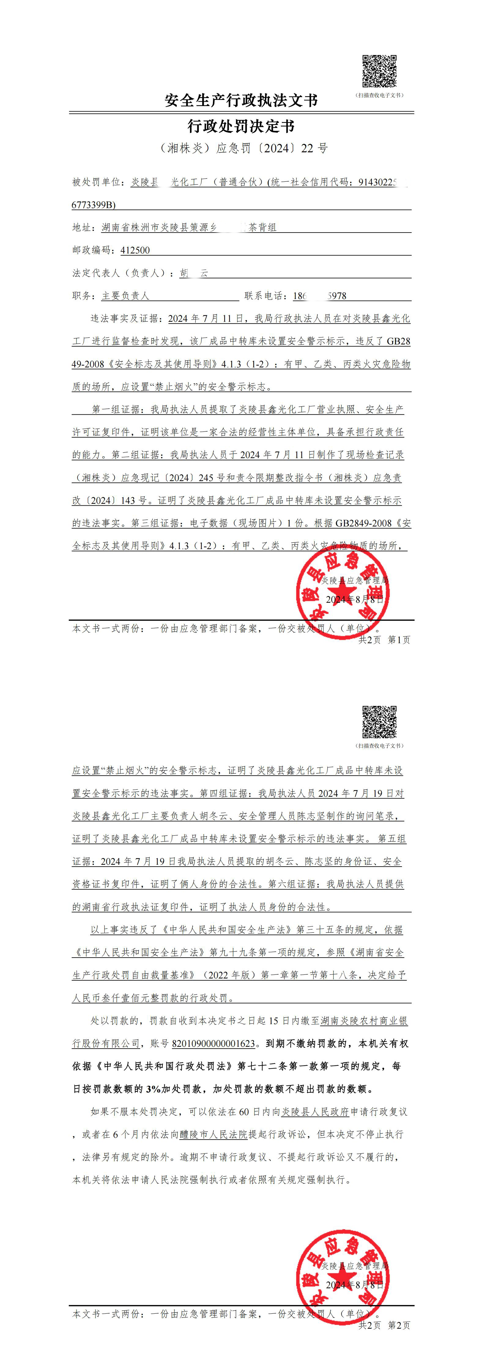 炎陵县应急管理局行政处罚决定书(湘株炎)应急罚〔2024〕22号