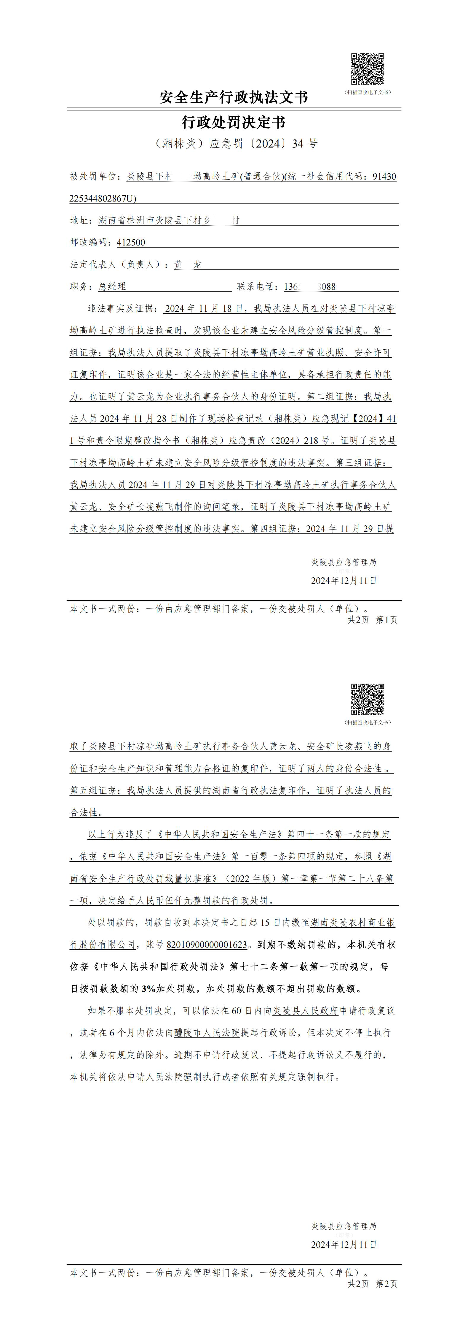 炎陵县应急管理局行政处罚决定书(湘株炎)应急罚〔2024〕34号