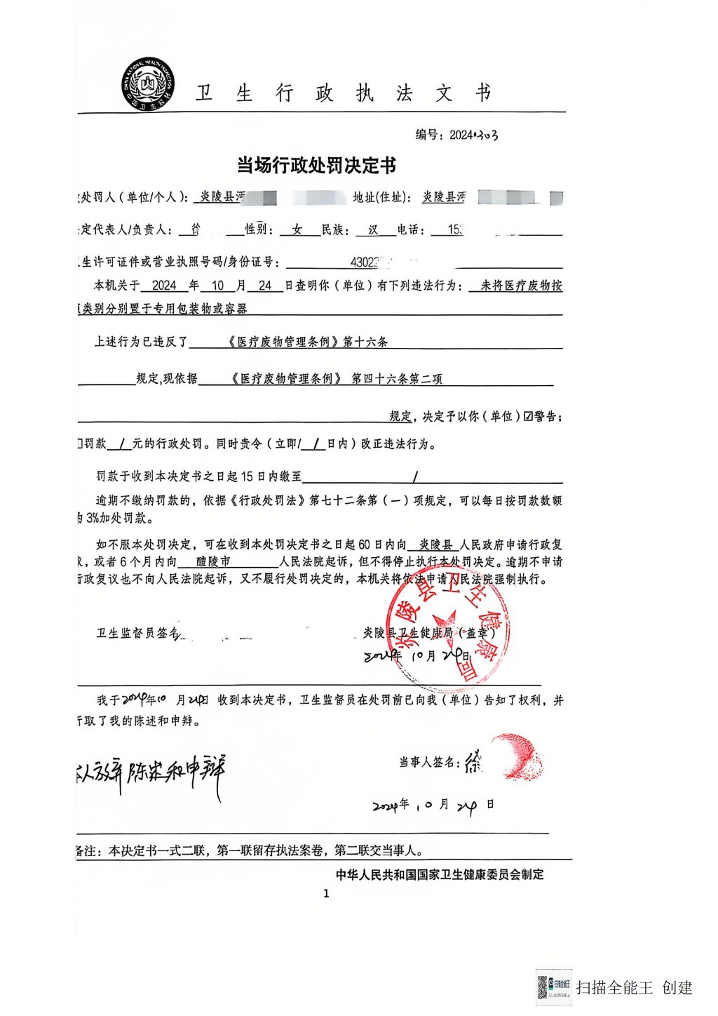 炎陵县卫生健康局行政处罚决定书20240303
