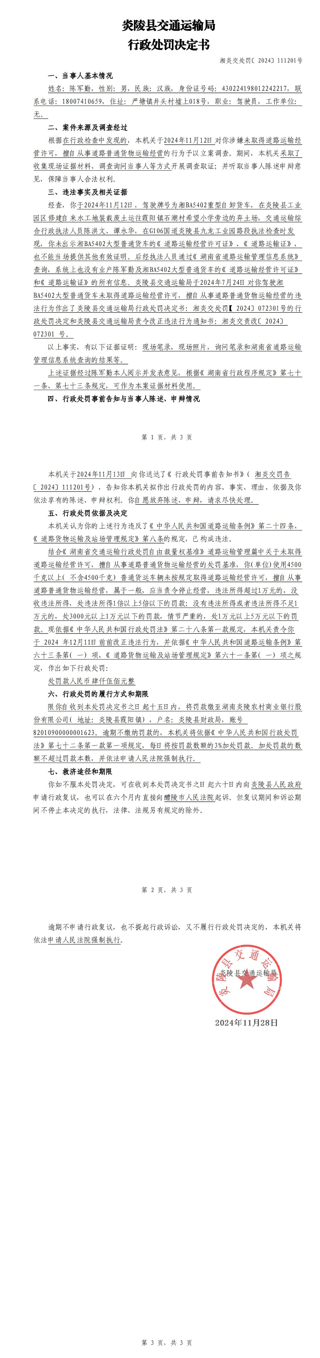 炎陵县交通运输局行政处罚决定书湘炎交处罚〔2024〕111201号
