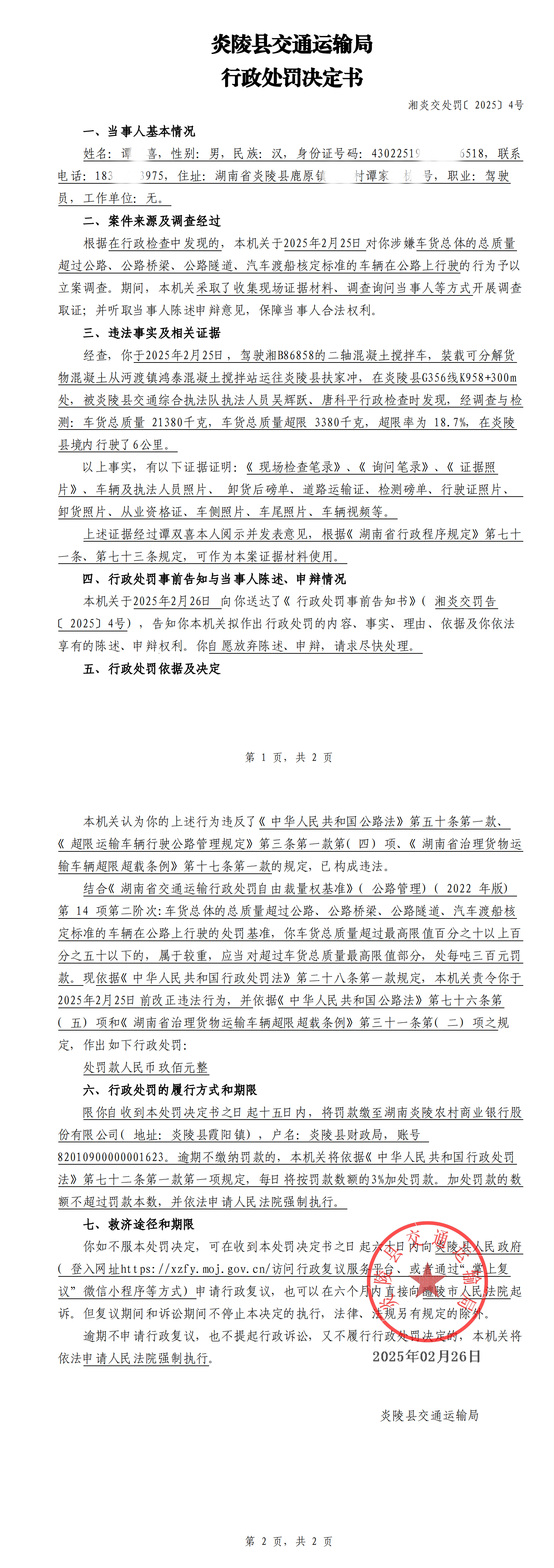 炎陵县交通运输局行政处罚决定书湘炎交处罚〔2025〕4号
